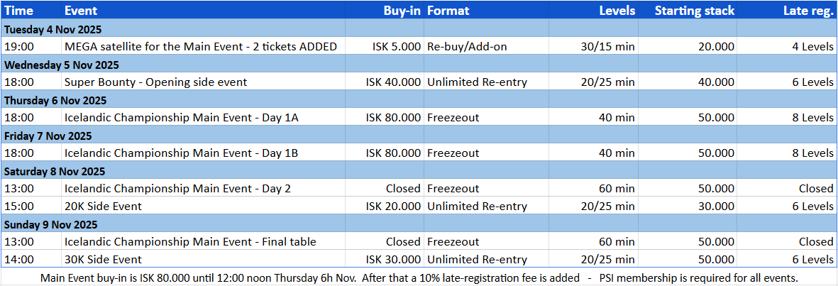 All events are open to all nationalities and the winner of the Main Event will win the title “Icelandic Poker Champion”. A PSÍ (Icelandic Poker Federation) membership is required for participation in all events organized by PSÍ.